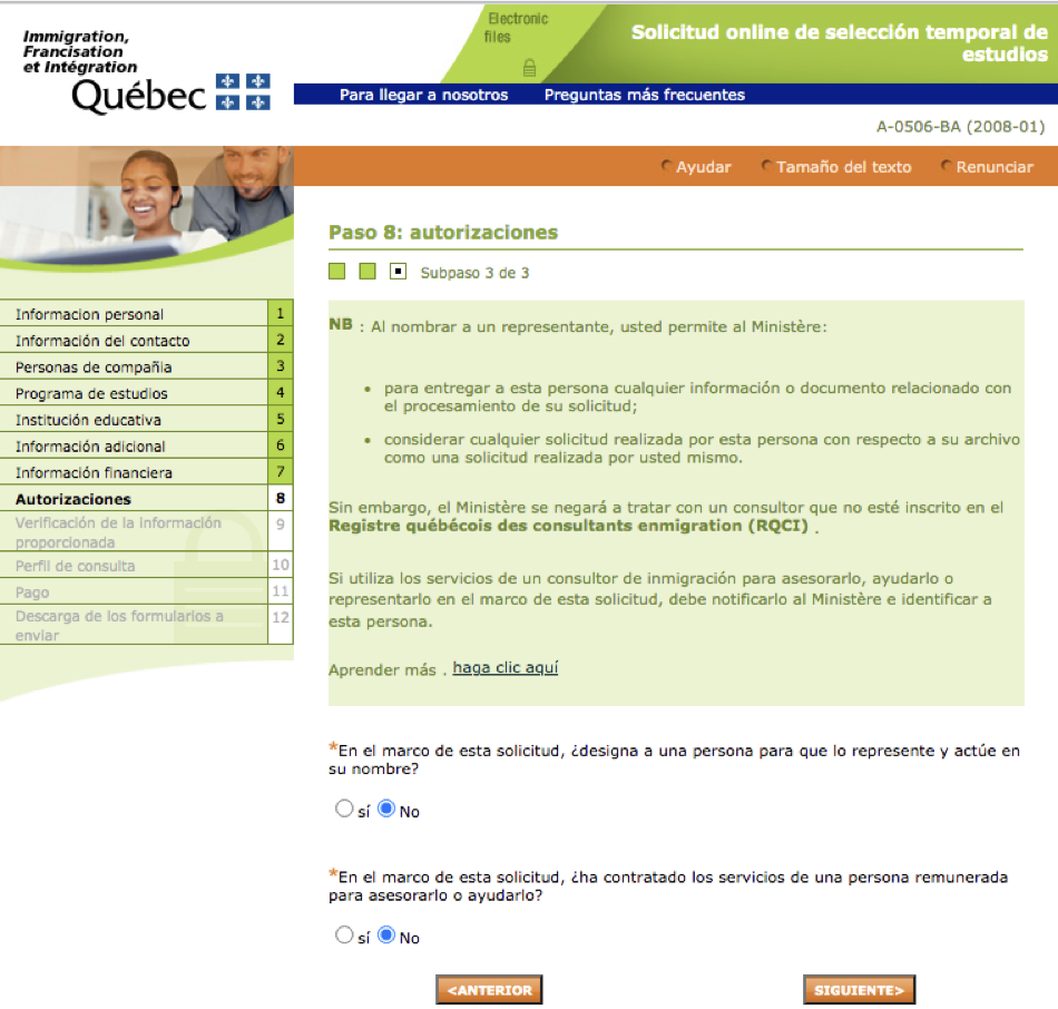 Este espacio se refiere a alguien que le este ayudando a tramitar este permiso, deberá ser alguien certificado por el gobierno Canadiense para que sea un representante legal, según su caso responda.